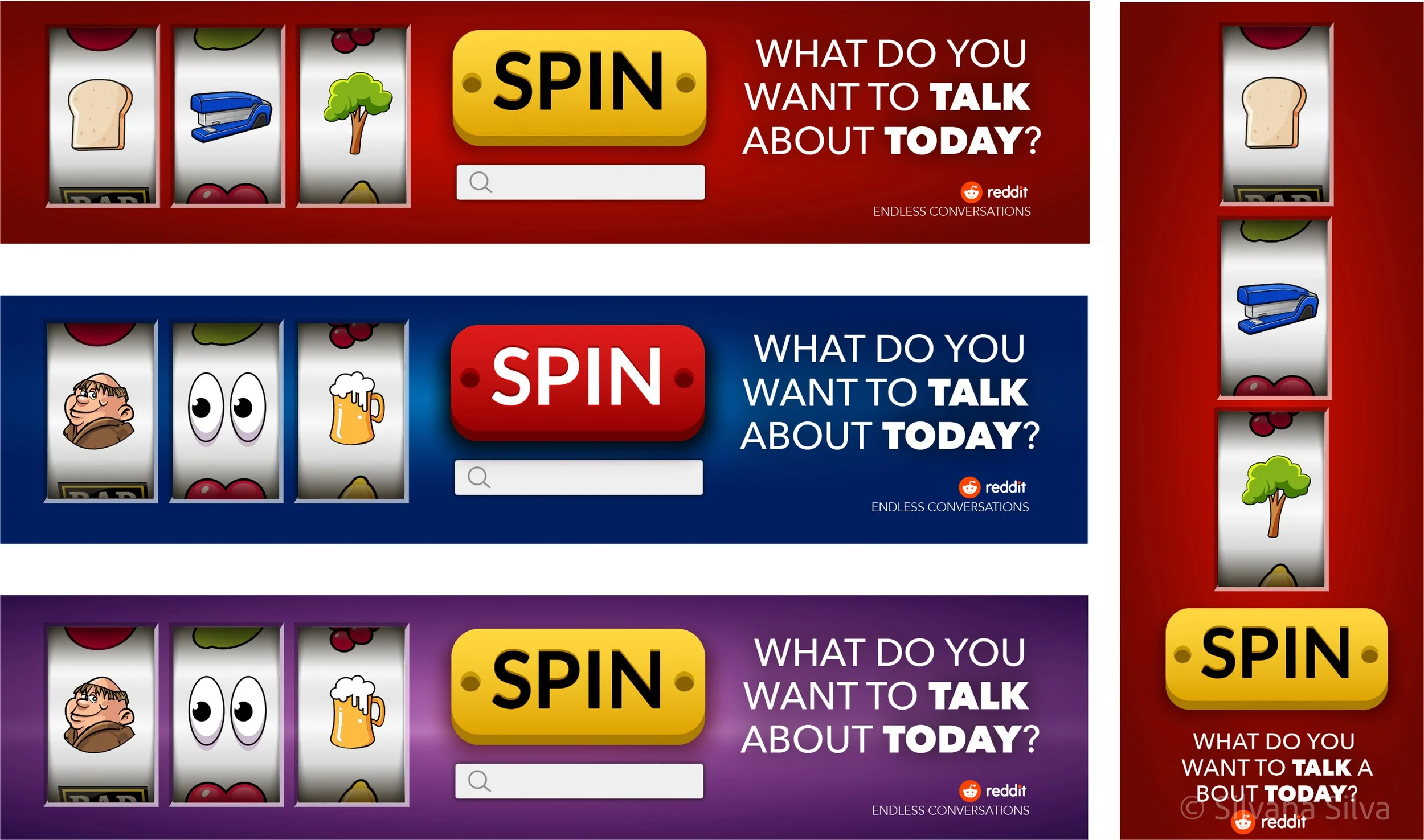 Interactive banners for websites. Click “SPIN” to get a random combination of icons. Although the combination may seem odd, we assure you there will be a reddit about it.